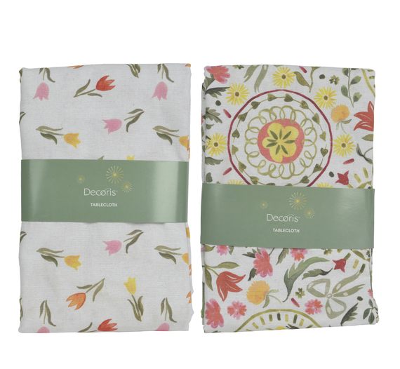 Внесете жизнена атмосфера на вашата маса за хранене с тази покривка за маса Decoris. Фините шарки на лалета в множество цветове придават на вашия интериор свеж и естествен вид. Покривкита е изработена от смес от полиестер и памук, осигуряваща приятна текстура и издръжливо покритие с дигитален печат. Идеална за вътрешна употреба и перфектно допълнение към всеки модерен или класически декориран дом.